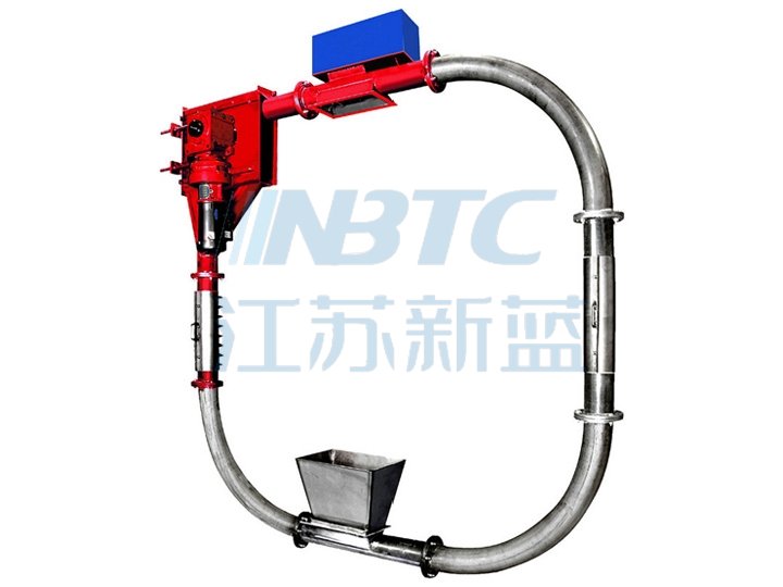 管鏈輸送機是輸送粉狀、小顆粒狀及小塊狀等散狀物料的連續(xù)輸送設(shè)備,可以水平、傾斜和垂直組合輸送。在密閉管道內(nèi),以鏈片為傳動構(gòu)件帶動物料沿管道運動。當(dāng)水平輸送時,物料顆粒受到鏈片在運動方向的推力。當(dāng)料層間的內(nèi)摩擦力大于物料與管壁的外摩擦力時,物料就隨鏈片向前運動,形成穩(wěn)定的料流;當(dāng)垂直輸送時,管內(nèi)物料顆粒受鏈片向上推力,因為下部給料阻止上部物料下滑,產(chǎn)生了橫向側(cè)壓力,所以增強了物料的內(nèi)摩擦力,當(dāng)物料間的內(nèi)摩擦力大于物料與管內(nèi)壁外摩擦力及物料自重時,物料就隨鏈片向上輸送,形成連續(xù)料流。